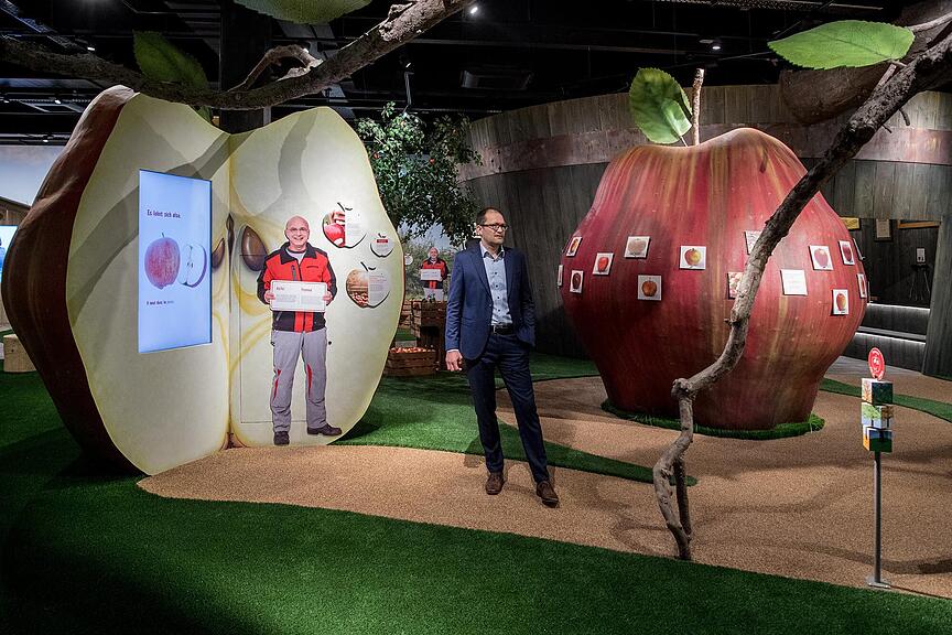 Mit Hunderten von denen – besser gesagt mit Fotos von Ästen mit Knospen und ebendiesen Blüten – sind die Wände tapeziert. Aus dem künstlichen Rasen am Boden ragen künstliche Apfelbäume. Weiter stehen zwei überdimensionale Äpfel und ein riesiges Mostfass im Raum. Überall gibt’s etwas zu lernen. Zuerst über die Natur, dann über die Unternehmensgeschichte.