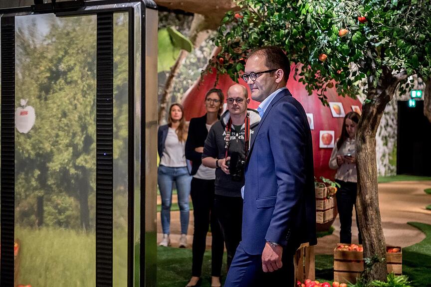 Der Pfeil «Innovation» – die verschiedenen Themengebiete sind so ausgewiesen – zeigt auf eine Mixstation. Da kann man eigenhändig den «Huustee» mischen. In einem kleinen Raum gegenüber läuft ein Kurzfilm. Schliesslich wird der Mostprozess auf sechs Bildschirmen dargestellt – und zeigt den Weg des Apfels vom Baum in die Flasche. Der krönende Abschluss ist dann die Degustation – so wird sichergestellt, dass auch wirklich alle fünf Sinne in die Welt von Ramseier eintauchen konnten. Vor dem Ausgang wartet wieder Bruno. In seiner Hand: ein Auf-Wiedersehen-Schild.