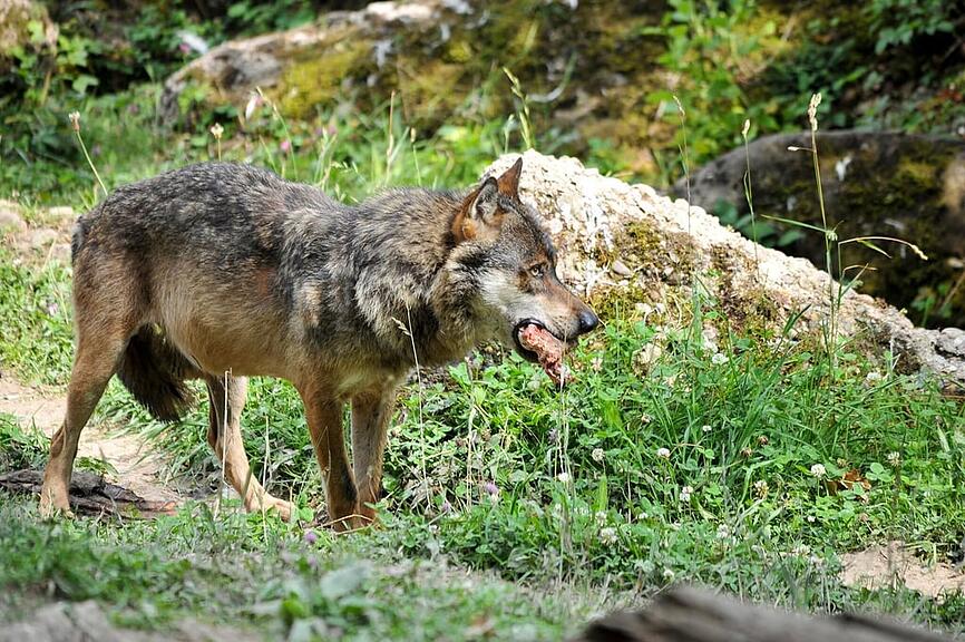 Ein Wolf im Tierpark Goldau mit Nahrung; es lässt sich hoffen, dass der Neuenkircher Wolf in freier Wildbahn keine Nutztiere reisst.