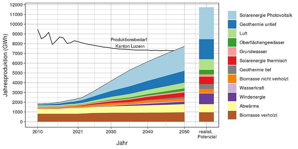 Untersucht wurden zwölf erneuerbare Energieträger: Photovoltaik, Solarthermie, Windenergie, Wasserkraft, Holzfeuerung, Biogas, Geothermie, Erdsonden, Grundwasser, Oberflächengewässer, Luft und Abwärme. Eine vollständig erneuerbare Energieversorgung ab 2050 durch den Einsatz all dieser untersuchten Energieträger sei möglich, schreibt der Kanton in einer Mitteilung. Bereits heute belege der Kanton Luzern beim Ausbau der Photovoltaik einen Spitzenplatz. Potenzial sieht der Kanton insbesondere bei Solarpanels auf Hausdächern sowie an Fassaden.
