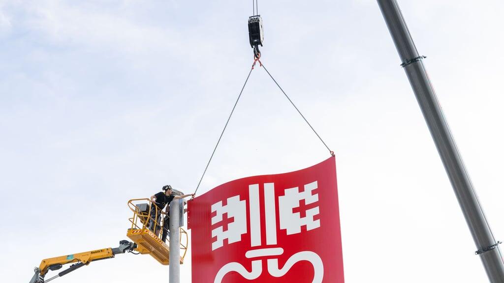 Der Schwertransport erregt auf seiner Fahrt von Dallenwil nach Ennetbürgen viel Aufmerksamkeit mit seiner ikonischen Fracht. Unübersehbar liegt auf dem Tiefladewagen die Nidwaldner Fahne: Ein weisser Schlüssel prangt auf rotem Grund. Materialisierung und Dimensionen haben es in sich: Fünf auf fünf Meter gross ist die Fahne auf gewölbtem, zwei Zentimeter dickem Stahl. Für den Transport war eine Spezialbewilligung nötig.