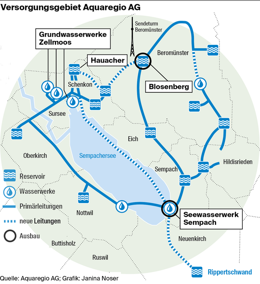 Unter anderem wird für rund 5,37 Millionen Franken die Seeleitung zwischen den beiden Hauptwasserversorgern der Region – dem Seewasserwerk in Sempach und den auf Surseer und Schenkoner Boden liegenden Grundwasserwerken im Zellmoos verlegt. Weiter ist eine Verbindungsleitung zwischen dem Wasserreservoir Hauacher (Schenkon/Sursee) zum Reservoir auf dem rund 800 Meter hoch gelegenen Blosenberg beim ehemaligen Landessender Beromünster für zirka 3,3 Millionen Franken geplant. Zudem soll eine neue Leitung für 6 Millionen Franken zwischen dem Reservoir der Wasserversorgung Emmen in Rippertschwand (Neuenkirch) und dem Sempacher Seewasserwerk entstehen.Quelle: www.aquaregio.ch sowie Sacha Heller, Präsident der Geschäftsleitung von Aquaregio.