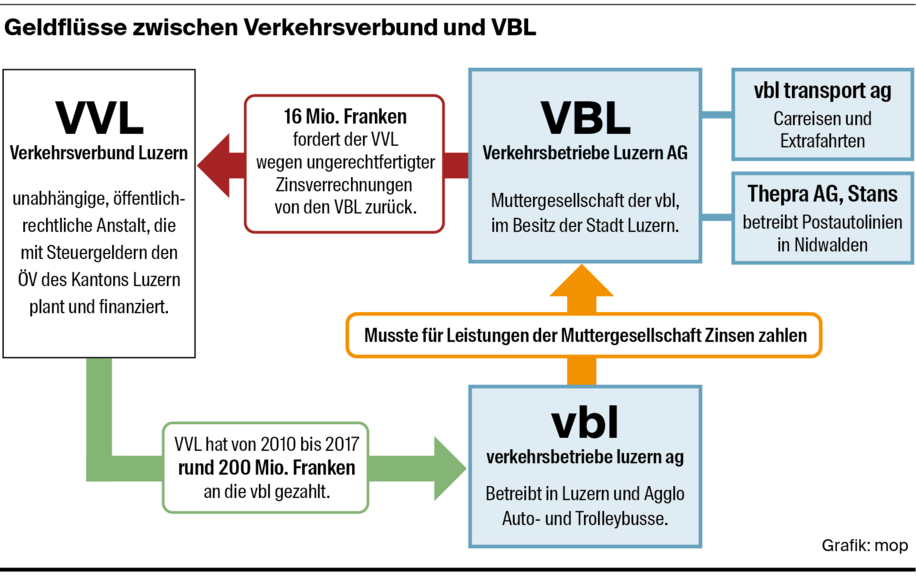 Das funktionierte laut BAV wie folgt: Die Holding verrechnete ihrer Tochter nicht nur die effektiven Kosten für Busse und Chauffeure, sondern sie verlangte zusätzlich auch noch Zinsen. Dadurch habe die VBL im subventionierten Personenverkehr verbotenerweise Gewinne erzielt. Es geht um eine Summe von 16 Millionen Franken, welche der Verkehrsverbund Luzern als grösster Geldgeber zurückfordert: