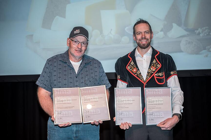 Freuen sich über ihre Diplome: Thomas Scheuber (Alpkäserei Untertrüebsee, links) und Florentin Spichtig (Alpkäserei Surenen). Nicht an der Preisverleihung war Sälmi Töngi.