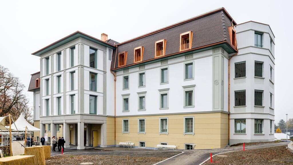 Wenn man im hellen Patientenzimmer steht, fällt der Blick unweigerlich hinaus: über den Sportplatz, hin zum Sarnersee, wo sich der Nebel an diesem Samstag hartnäckig auf der Wasseroberfläche hält. Drinnen ist es funktional – ein Bett mit Nachttisch, Schrank, Tisch und Stühle, ein Bad –, aber mit Charme, sanfte Grüntöne ziehen sich im Gang durch die Wände, nie ganz bis zur Decke, ein Gruss aus der Vergangenheit. Wer hier ankommt, merkt: Dies ist kein Ort des Wegsperrens, sondern ein Haus, das offen sein will – freundlich, ruhig, mit viel Raum für Licht und Leben.