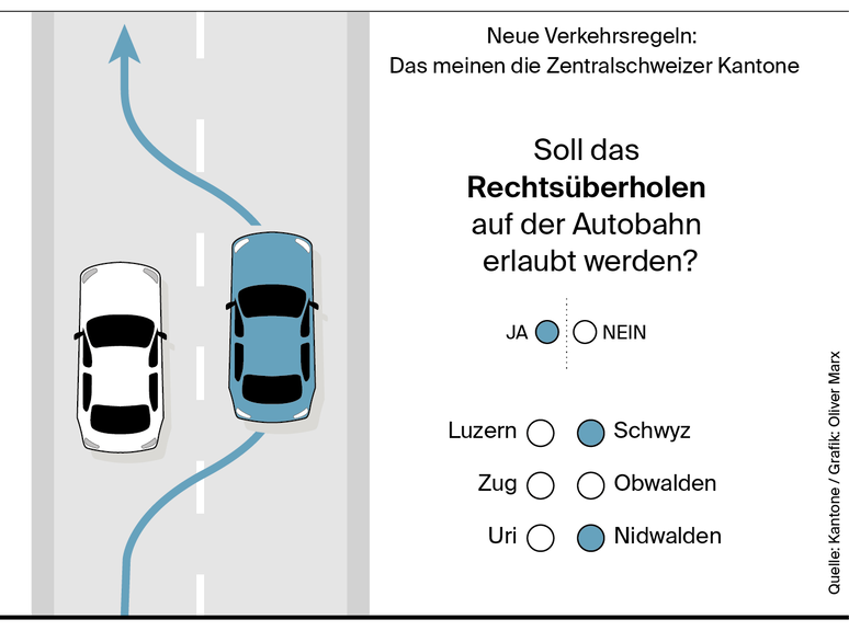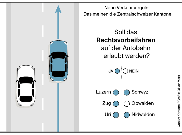 Was täglich auf Schweizer Autobahnen vorkommt, ist für viele Lenker ein grosses Ärgernis. Das will der Bundesrat ändern. Künftig soll es erlaubt sein, rechts vorbeizufahren. Das Wechseln der Fahrspur, um rechts zu überholen, soll hingegen verboten bleiben. So sieht es der Entwurf für die Änderung der Verkehrsregelverordnung vor. Nun ist die Vernehmlassung abgeschlossen. Die Auswertung der Vernehmlassungsantworten durch unsere Zeitung zeigt: Einig sind sich die Kantone nicht. 15 Kantone wollen wie der Bundesrat das Rechtsvorbeifahren erlauben, nicht aber das Überholen. Darunter sind Luzern, Zug und Uri.