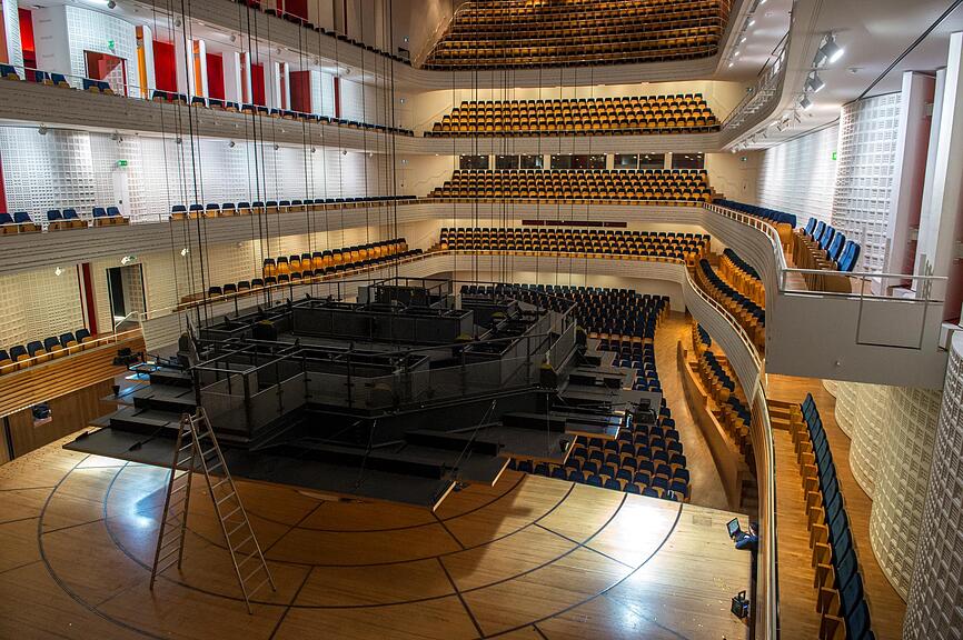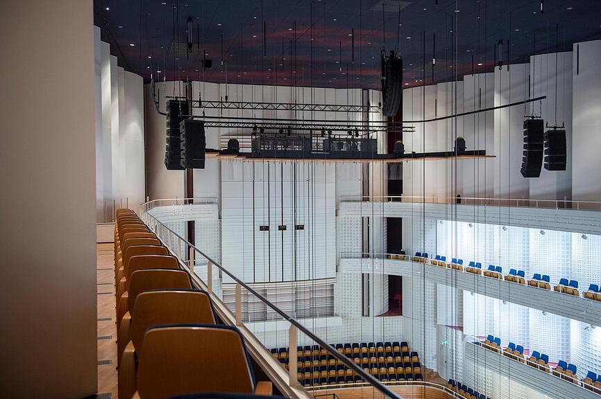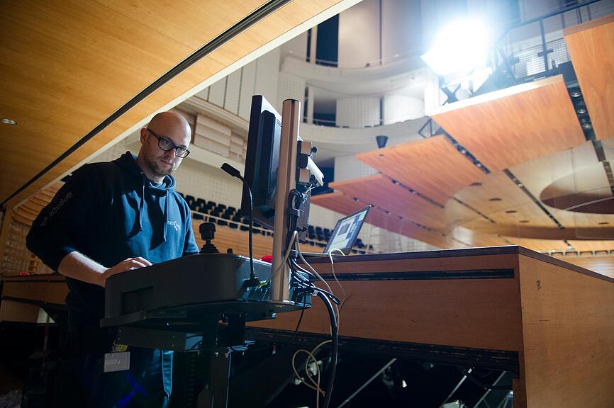 Man geht mit Jürg Schär in den Konzertsaal, wo vorne über der Bühne das Canopy weit heruntergelassen und Elektrotechniker und Bauleiter Dirk Kindler vor allem digital unterwegs ist: