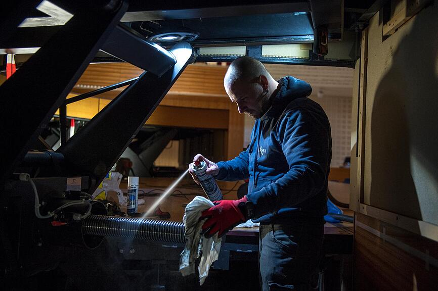 Im Radio der Arbeitenden läuft mal Volksmusik, mal Hip-Hop. Auf dem Boden liegen noch ein paar silberne Papierschnitzel von den Swiss Music Awards. Man kniet sich hin und lugt unter die Bühne. Hier geht es gerade materiell zur Sache: 41 Spindeln werden durch Mathias Schulze entfettet und neu gefettet, um ihren Verschleiss zu minimieren:
