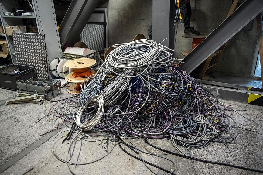 Ein eindrückliche Perspektive. 19 Steuerkästen wurden hier oben gerade ausgetauscht. Und fast stolpert man über einen Haufen alter Kabel, die demnächst entsorgt werden: