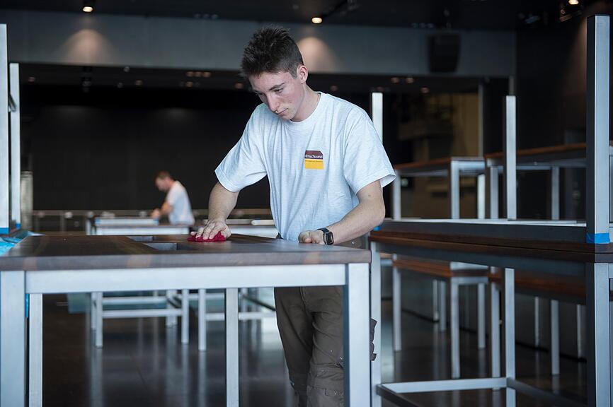 In die Tiefe geht es nun erneut zu Fuss – die Lifte werden ja saniert. Im Eingangsbereich frischen Arbeiter wie Justin Flüeler gerade die Tische des World Café auf.