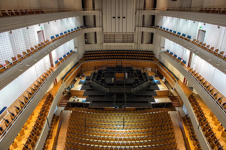 Es muss nicht nur die Steuerung des Canopys – dieses riesigen höhenverstellbaren Schallreflektors, der an zwei Seilzügen hoch- und runtergefahren wird – neu justiert werden, sondern auch die Steuerung der 41 höhenverstellbaren Bühnenelemente sowie jene der zahlreichen Echotore an den Seiten des Saals. Alles in allem geht es um den Erhalt des perfekten Klangs.