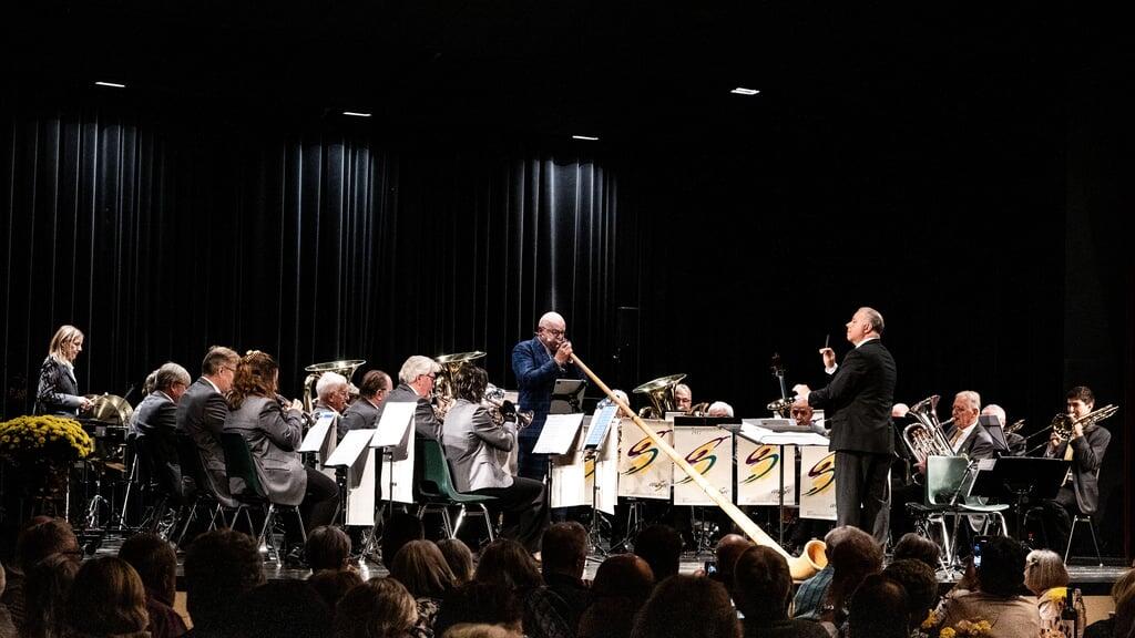 Die Senior Band der Musikgesellschaft Risch-Rotkreuz mit dem Dirigenten Thomas Gabriel und dem Solisten Armin Bachmann auf dem Alphorn.