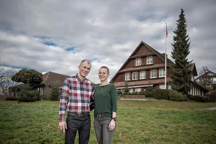 Rolf und Martina Wey-Emmenegger sitzen im Sääli der Wirtschaft Zur Schlacht in Sempach. Die Mittagshektik ist vorbei, die letzten Gäste geniessen ihr Dessert, Stammkunden klopfen einen Jass in der Gaststube. Bevor die beiden Gastgeber auf die Fragen antworten, schauen sie sich häufig kurz an. «Willst du beginnen, zu erzählen?», fragt Martina Wey ihren Mann.