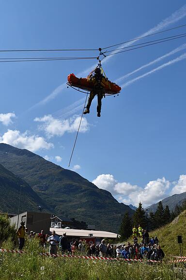 Rettungschef Carlo Danioth führte durchs Programm und lieferte interessante Details über das Rettungswesen allgemein, speziell über die 40-köpfige Rettungsstationen Göschenen und Andermatt. Auf Posten eins rettete man eine verunfallte Person mittels Seilbahn. Dann zeigte ein Geländesuchhund auf eindrückliche Art sein Können, in Rekordzeit fand er einen verunfallten Bergsteiger. Am Schluss rettete man eine Person mittels Seilbahn mit Statikseilen aus einer Schlucht. Mit hoher Sicherheit demonstrierten die Retter ihr Können und ernteten am Schluss grossen Applaus.