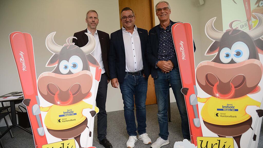 Ein rund 1,5 Meter grosser, aufrecht stehender und sichtlich bestens gelaunter Uristier in einem gelben Pullover mit Alpinskis und Skistöcken in den Händen und dem aufgedruckten Namen «Urli» zierte am 10. September den Haupteingang der Firma Kässbohrer AG in Altdorf. Ganz oben im Konferenzraum des Firmengebäudes gab es noch zwei weitere solche «Urlis». Sie flankierten eine Medienkonferenz, an der Hans-Ueli Imholz, Mitinhaber der Imholz Sport AG in Bürglen, und Remo Bulgheroni, Geschäftsführer der Kässbohrer Schweiz AG, eine interessante Neuerung vorstellten. Skifahren im Urnerland für Familien erschwinglicher machen und gleichzeitig die Klein-Skigebiete Biel, Brüsti, Eggberge, Gitschenen, Haldi, Ratzi, Realp und den Kinderlift in Unterschächen erhalten und fördern – so lautet die Idee der beiden innovativen Unternehmer. «Urli» dient dafür als Maskottchen.