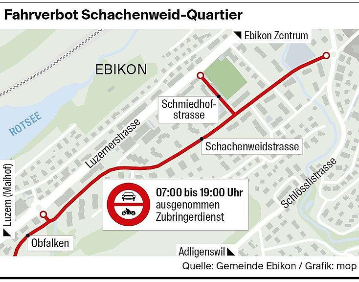 Ebikon führt ab dem 31. Juli 2025 ein Fahrverbot auf der Schachenweidstrasse, der Schmidhofstrasse und dem Obfalken ein, das täglich von 7 bis 19 Uhr gelten wird. Wie die Gemeinde auf Anfrage mitteilt, erlässt sie das Verbot aufgrund von Rückmeldungen aus der Bevölkerung, die den Lärm sowie die Sicherheit bemängelt hätten. Ausgenommen vom Verbot sind Anwohnende sowie Zubringerinnen und Zubringer. Ziel der Massnahme sei, den zunehmenden Schleichverkehr im Quartier zu unterbinden und zurück auf die Luzernerstrasse zu führen. So soll sich die Lebensqualität der Anwohnenden wieder verbessern.