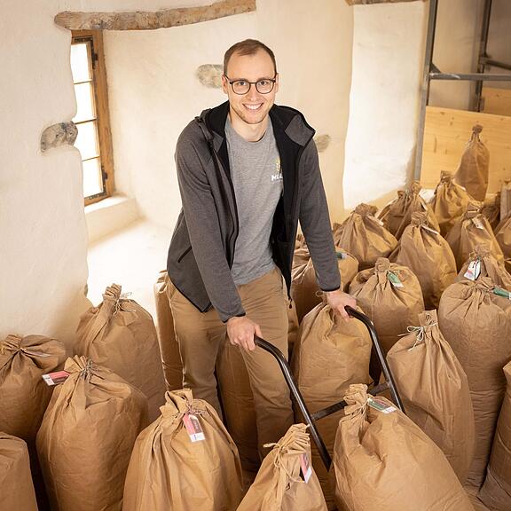 Jonas Imfeld führt zusammen mit seiner Familie die historische Bio-Mühle und den dazugehörigen Bio-Bauernhof in Geuensee. Sie setzen sich täglich für den Erhalt des alten Handwerks, die Förderung der Biodiversität und die Produktion naturbelassener Produkte ein. Mit dem Anbau und Verkauf der alten Getreide-arten Emmer und Einkorn sowie der Haltung von ProSpecieRara-Schafen fördern sie die Artenvielfalt./>