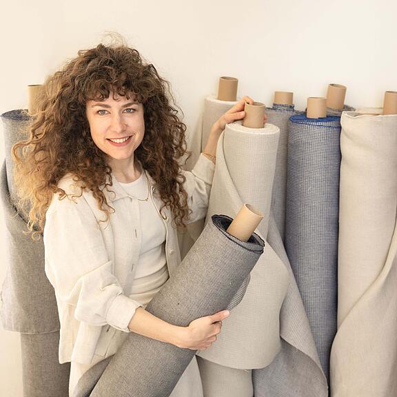 Mira Durrer setzt sich für eine nachhaltige Textilindustrie ein, indem sie ein Netzwerk für regionale Lieferketten aufbaut. Vom Feld bis zum fertigen Leinenstoff: Alles wird in der Schweiz produziert und ist biologisch abbaubar. Durch gemeinsame Bestellungen können Modeschaffende, Inneneinrichtungs-geschäfte und Privatkund:innen nachhaltig produzierte Stoffe in kleinen Mengen beziehen./>
