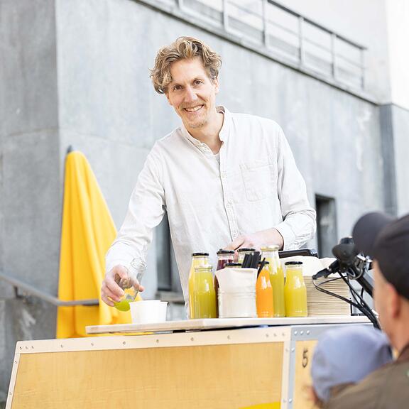 Armin Häfliger ist Gründer von meinRad. Mit seinem Team produziert er täglich im grossen Stil Mittagessen und Säfte aus biologischen Zutaten. Viele Zutaten kommen direkt von regionalen Bio-Betrieben. Das Motto ist: gesund, frisch, günstig und ökologisch. Die Produkte werden per Lastenvelo verkauft und geliefert. Mit seinem Engagement leistet er einen Beitrag zur nachhaltigen Verpflegung./>