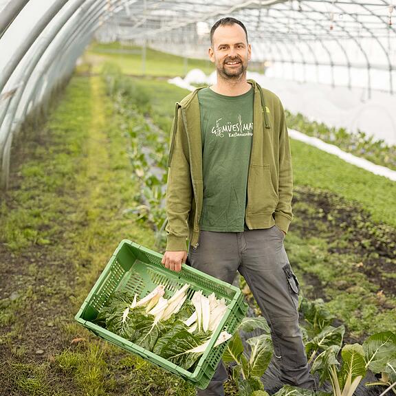Sebastian Ineichen führt mit seinem Team den Bio-Gemüsebetrieb Mattli in Kastanienbaum bei Luzern. Er betreibt einen Hofladen und bietet zudem ein Gemüse-Abo an. In Begleitbriefen zu den gelieferten Gemüsekistchen informiert er über die Produktion – und fördert so das Verständnis für nachhaltige Landwirtschaft./>