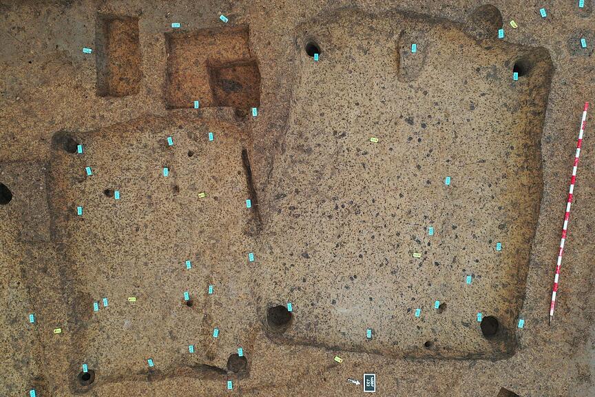Die archäologischen Befunde umfassen die Überreste zahlreicher Holzgebäude, darunter Wohn- und Wirtschaftsgebäude, die typischerweise als Pfostenbauten konstruiert wurden: Die hölzernen Ständer der Wände waren direkt im Boden verankert, weshalb von solchen Gebäuden in erster Linie charakteristische Reihen von Pfostenlöchern zeugen.