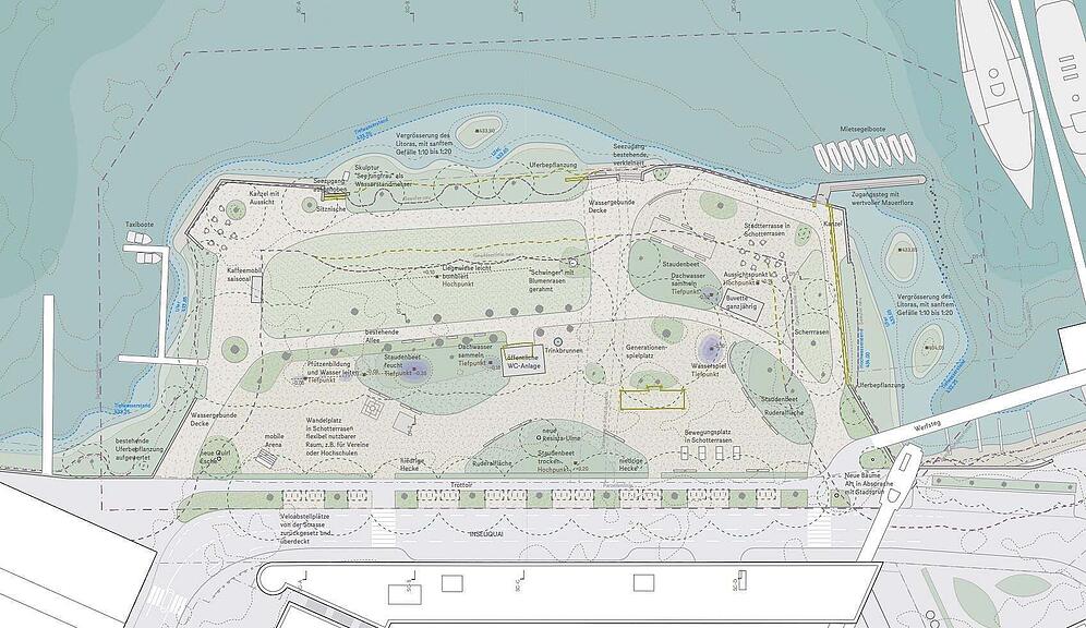 Die seeseitige Grünfläche , die eine beliebte Liegefläche ist, wird deutlich vergrössert.