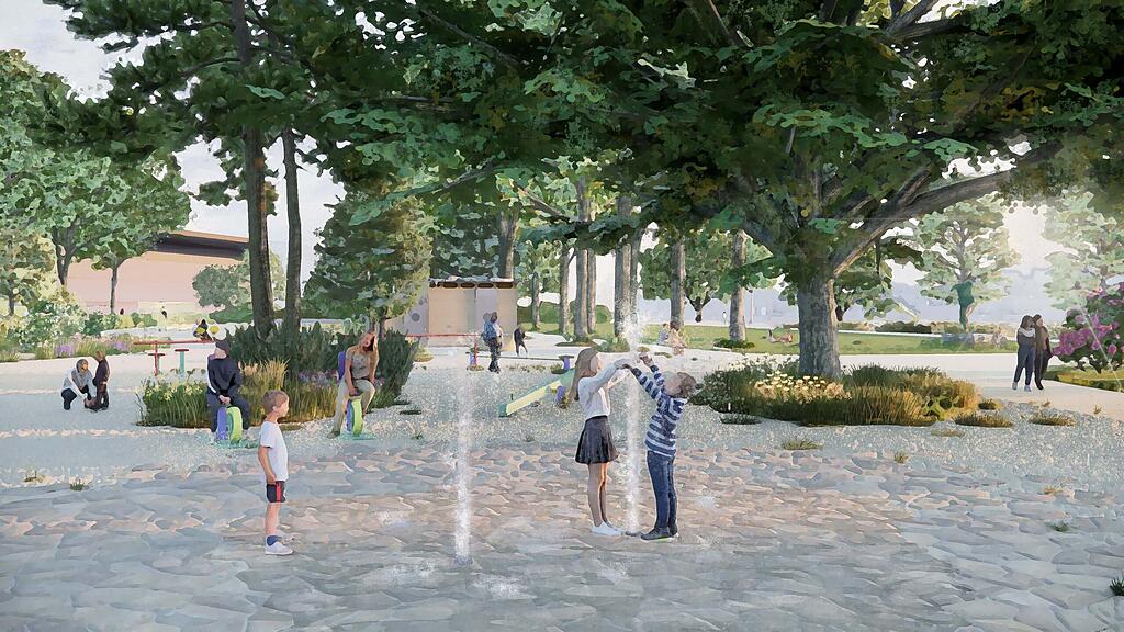 Im Süden (heute Buvette Volière) wird eine sogenannte Stadtterrasse geschaffen - neu mit einer ganzjährigen Buvette und einem flexiblen Generationenspielplatz mit Wasserspiel .