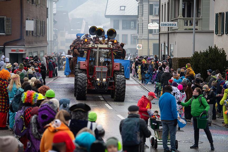 Nun, an Stelle von Schnee ergiesst sich dafür am frühen Nachmittag ein farbiger Konfettiregen über die Dorfstrasse. Fasnächtlich grossherrschaftlich marschiert der «Geisshorner» exakt auf den 14 Uhr-Schlag der Dorfkirche an der Spitze des diesjährigen Umzugs los. Dann schweigen die Kirchenglocken zwar nicht, aber die nächsten vier Viertelstundenschläge gehen im lauten Fasnachtstreiben unter.