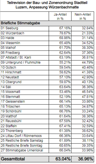 Die Umzonung der Würzenbachmatte war derart umstritten, dass sie nicht ins Gesamtpaket der BZO-Revision (siehe Kasten am Ende dieses Textes) gepackt wurde. Vielmehr mussten die Stadtluzerner Stimmberechtigten separat über diese Frage abstimmen. Das Resultat ist nun mit 63 Prozent Ja überraschend deutlich: Sämtliche Quartiere befürworteten die Umzonung. Damit wird der Weg frei für die geplanten Alterswohnungen der Reformierten Kirchgemeinde auf dem Areal Würzenbachmatte.