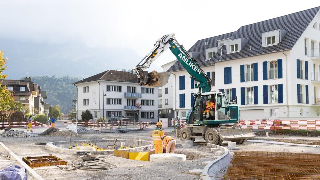 Klopfgeräusche hallen im Takt. Kopfsteinpflaster um Kopfsteinpflaster nimmt der Stansstader Dorfplatz seine neue Gestalt an. Seit hier Anfang Jahr die Baumaschinen aufgefahren sind, ist schon einiges gegangen, auch wenn nicht das ganze Ergebnis erkennbar ist, weil schon wieder zugeschüttet. In den vergangenen Monaten wurden im Gebiet rund um die Sust neue Frischwasser-, Abwasser- und Regenwasserleitungen verlegt, ebenso die elektrischen Leitungen. Der zuständige Gemeinderat Andy Christen ist zufrieden mit dem Baufortschritt. «Wir sind im Zeit- und Kostenrahmen», stellt der Vorsteher des Departements Tiefbau und Werke bei einem Baurundgang erfreut fest. Nun sind die oberirdischen Arbeitsschritte an der Reihe, wie unschwer zu erkennen ist.