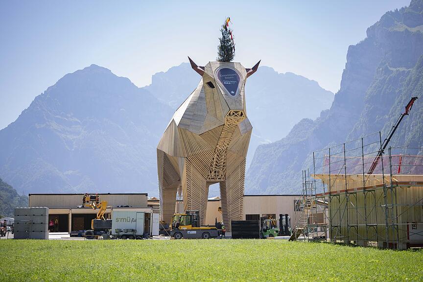 Er ist 21 Meter hoch, 36 Meter lang, 10 Meter breit und 182 Tonnen schwer: Muni Max. Die Holzskulptur steht seit kurzem auf dem Festgelände am Eidgenössischen Schwing- und Älplerfest (Esaf) im glarnerischen Mollis und soll neben dem Schwingsport die Attraktion am Fest werden. Beteiligt am Bau waren rund 220 Betriebe. Max ist vollständig aus Schweizer Holz angefertigt – ein echtes Meisterwerk handwerklicher Kunst. «Max verfolgt das Ziel, die Zusammenarbeit der Branchen zu fördern, Traditionen zu bewahren und die Berufsbilder der Wald- und Holzwirtschaft sichtbarer zu machen», heisst es im Projektbeschrieb.