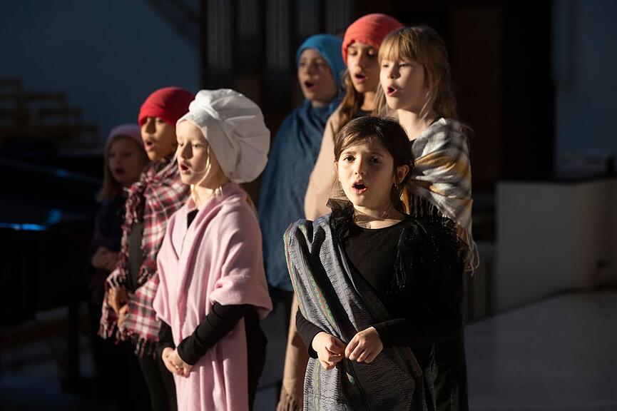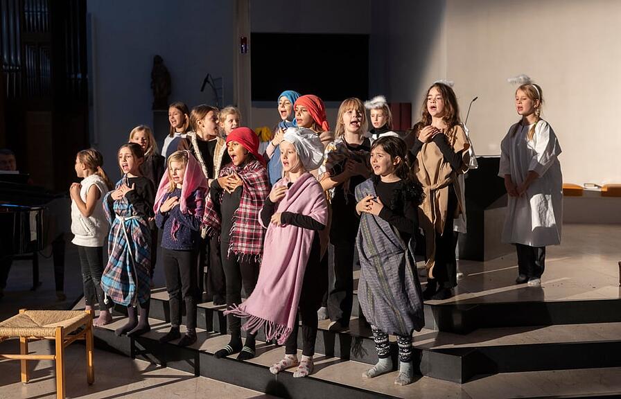 Die Botschaft der Geschichte um die Geburt Jesu erzählten die Kinder mit reichlich Freude und Elan. Im Scheinwerferlicht, ausgerüstet mit Gewändern und Körben, folgten auf Szenen der nahenden Volkszählung durch Kaiser Augustus die Verkündung der Empfängnis des Jesuskinds durch den Engel Gabriel an Maria sowie die verzweifelte Suche Maria und Josefs nach einer Gaststätte auf ihrer Reise nach Jerusalem. Selbstbewusst schauspielerten die Darstellenden und führten sogar vereinzelt gesangliche Soli auf, die besonders berührten. «Die Kinder gehen in ihren Rollen auf. Das Krippen- und Musikspiel mit der Musikbegleitung wirkt super», freute sich Ruedi Odermatt.