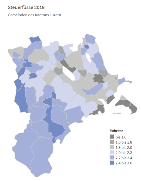 Allerdings bestehen zwischen den Gemeinden weiterhin grosse Unterschiede. Gemeinden mit einer besonders hohen relativen Steuerkraft finden sich vornehmlich am Vierwaldstätter- und am Sempachersee. Eine tiefe relative Steuerkraft findet sich in vielen stark ländlich geprägten Gemeinden des Entlebuchs und des Luzerner Hinterlands.