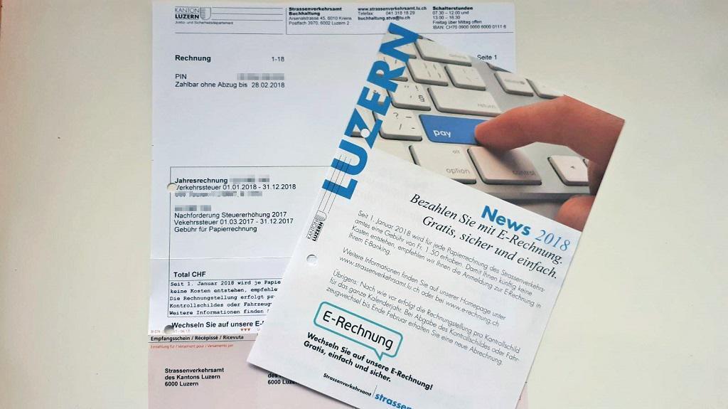 Seit Mittwoch ist klar: Das Luzerner Strassenverkehrsamt darf auf Papierrechnungen der Verkehrssteuer keine Gebühr mehr erheben. Allerdings gilt: Für alle weiteren Dienstleistungen stellt das Amt bei Rechnungen in Papierform weiterhin eine Gebühr von 1.50 Franken aus. Etwa bei Fahrzeug- oder Lenkerprüfungen, Fahrzeug-Einlösungen oder bei Schilder- und Halterwechseln. Denn hier handelt es sich um eine Kanzleigebühr, die rechtens ist – im Gegensatz zur Verkehrssteuer, die als Abgabe gemäss dem Entscheid des Kantonsgerichts anders zu behandeln ist.