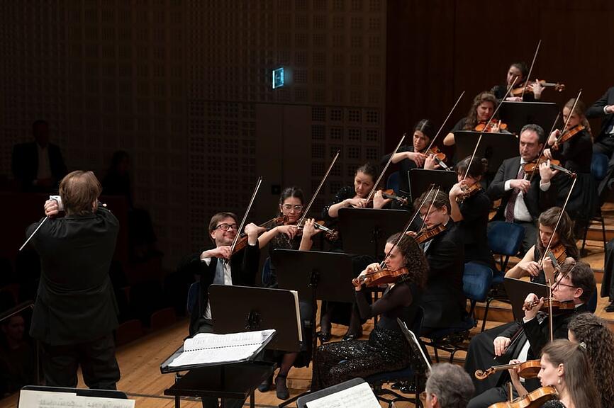 Am Donnerstagabend war es wieder so weit. In Anwesenheit von Hochschulrektorin Barbara Bader und Departementsleiter Musik Valentin Gloor sitzen Masterstudierende und Orchestermusikerinnen und -musiker Seite an Seite auf der grossen Bühne. Unter dem Titel «Von Walzern und Wogen» stehen anspruchsvolle Werke von Maurice Ravel, Claude Debussy und Richard Strauss auf dem Programm.