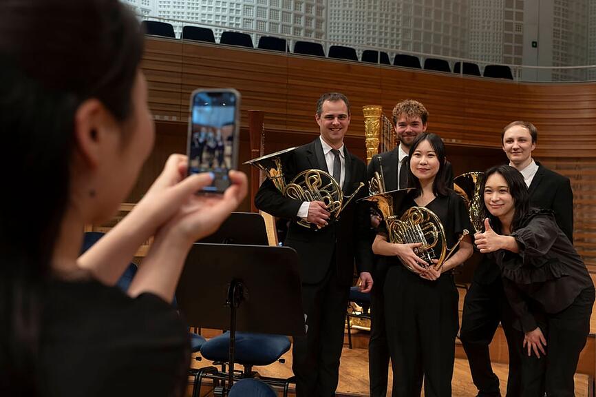 Die Rosenkavalier-Suite von Strauss birgt dann zuletzt noch die Gelegenheit, sich solistisch zu zeigen. Das beginnt beim Hornmonument zu Beginn und setzt sich mit mehrstimmigen Streichersoli, bei denen auch Studentinnen involviert sind, fort. Ermutigende Blicke und diskrete Applausgesten der Profis nach den Einzelleistungen motivieren weiter.