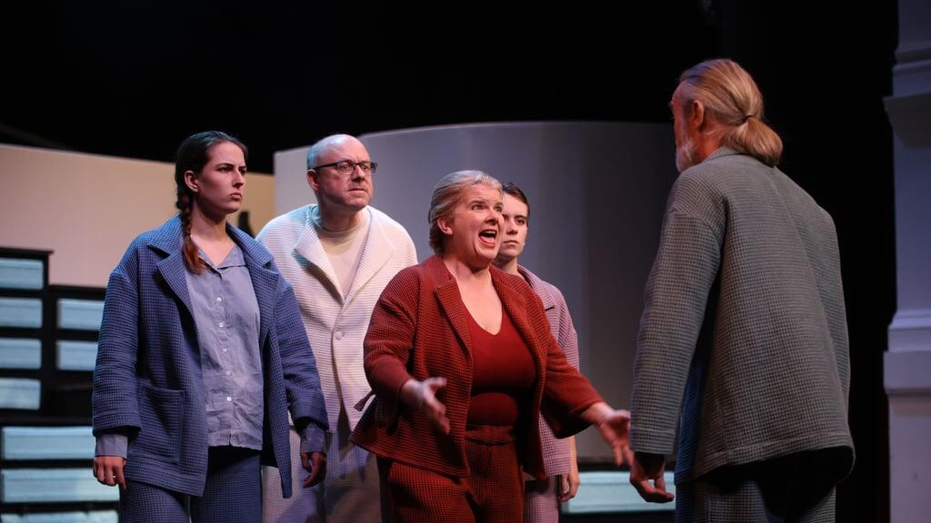 Beim Betreten des Alten Gymnasiums in Sarnen fühlt man sich in den Hochsommer zurückversetzt: überall aufblasbare Luftmatratzen, Liegestühle und Plakate mit badenden Menschen. Die Vorfreude setzt sich beim Anblick der einfach konzipierten Bühne fort. Im Hintergrund befindet sich eine Wand mit einer grossen Treppe aus teils beweglichen, teils festen Teilen, die mit blau-grünen, länglichen Rechtecken dekoriert sind, die vom Bühnenbildner Christof Bühler aus Pilz-Mycelien, Hanf und Sägemehl entworfen wurden. Das kubische Inventar ist modular, und auf der linken Seite befindet sich eine Leinwand, auf der beim Bühnenumbau jeweils das gleiche Pflanzenmotiv sichtbar wird.