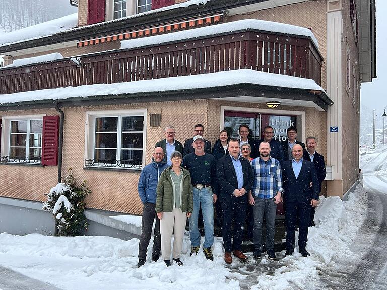 Gruppenbild des Regierungsrats mit einer Delegation des Gemeinderats bei Schneefall vor dem Tagungslokal Dasco in Isenthal.