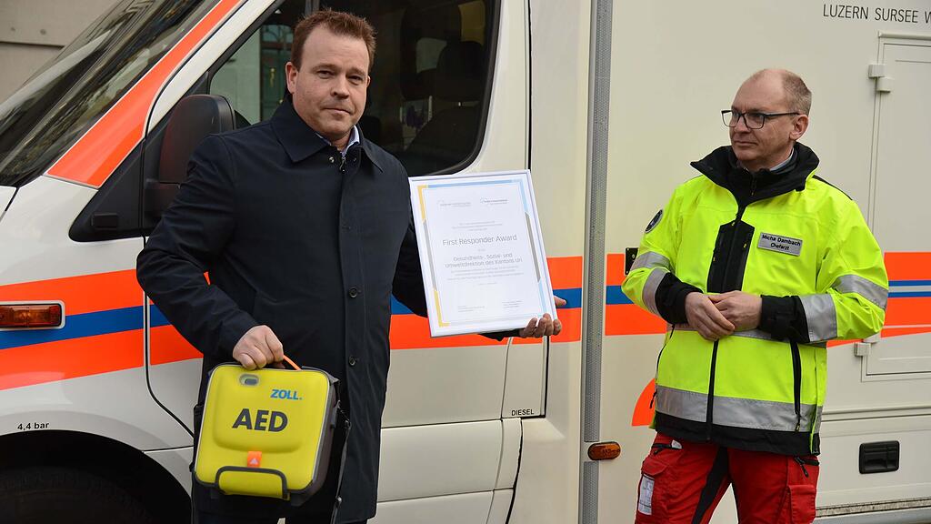 Gleich zwei Blaulicht-Fahrzeuge standen am vergangenen Montag um die Mittagszeit unmittelbar vor dem Eingang des Rathauses in Altdorf, was einige Passanten erstaunt zur Kenntnis nahmen. Es handelte sich um eine Ambulanz des Luzerner Kantonsspitals (Luks) und um einen Einsatzwagen des Kantonsspitals Uri (KSU). Erfreulicherweise waren die beiden Rettungsfahrzeuge nicht wegen eines Ernsteinsatzes, sondern aus freudigem Anlass dort stationiert. Sie dienten als Kulisse für die Übergabe des First-Responder-Awards.