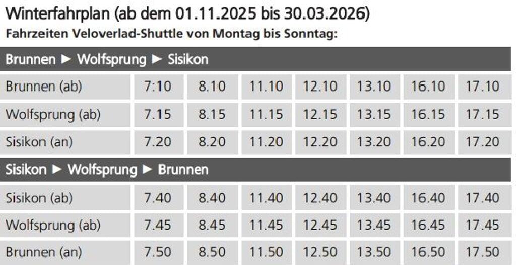 Neu fährt der Veloshuttle von Brunnen Richtung Sisikon jeweils siebenmal täglich zwischen 7 und 17 Uhr um zehn nach ab (kein Betrieb um 9.10 Uhr; 10.10 Uhr, 14.10 Uhr und 15.10 Uhr). In der umgekehrten Richtung fährt der Shuttle jeweils 40 nach ab, ebenfalls siebenmal täglich (kein Betrieb um 9.40 Uhr, 10.40 Uhr, 14.40 und 15.40 Uhr). Der Winterfahrplan gilt vom 1. November 2025 bis 30. März 2026. Weiter Infos sowie ein Lageplan der Haltestellen sind auf www.autobahnschweiz.ch zu finden. (inf)