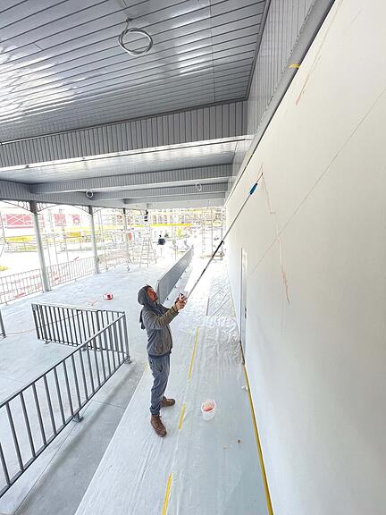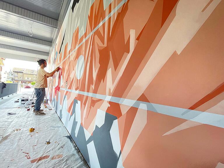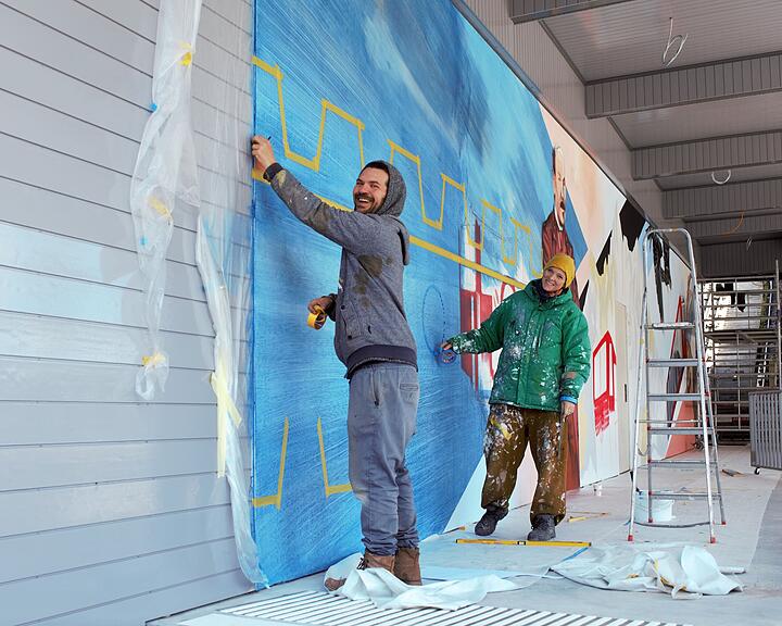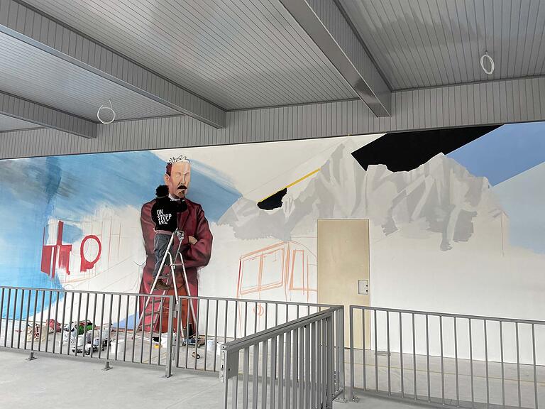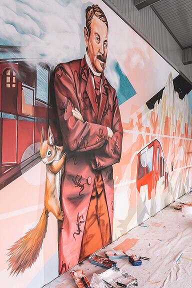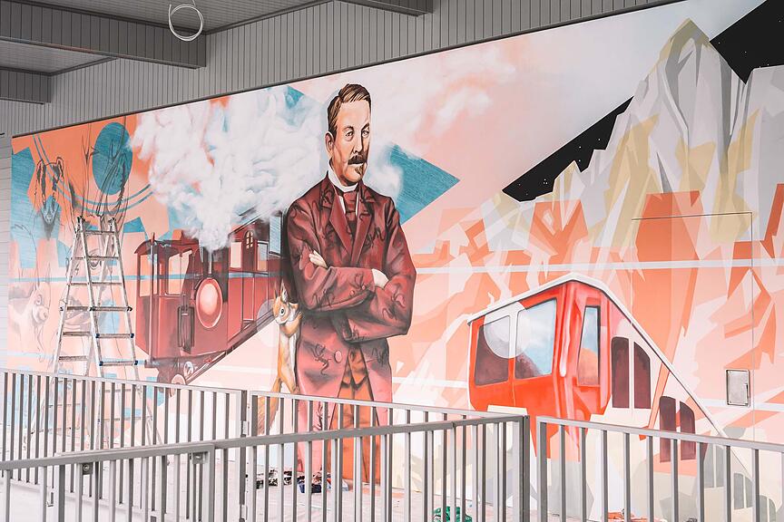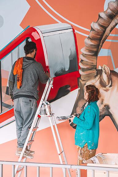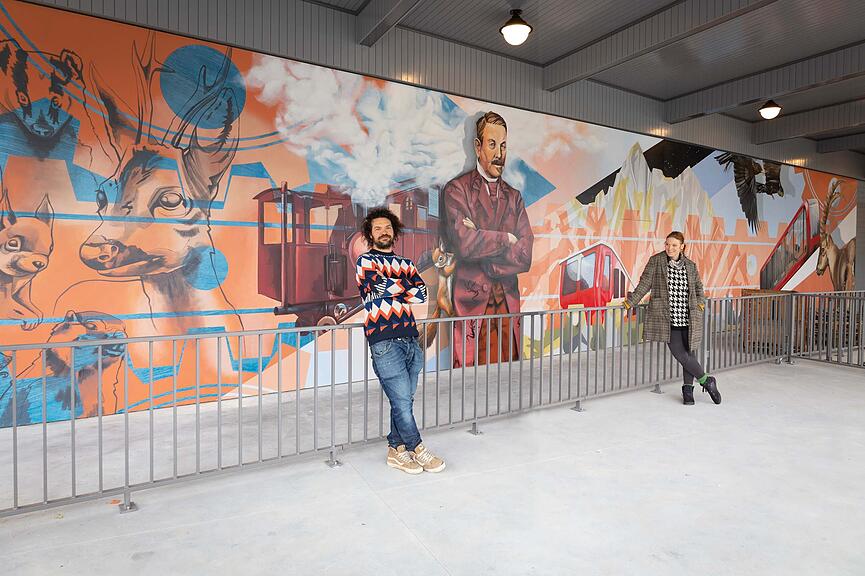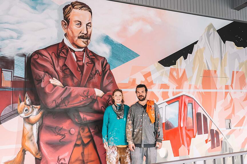 Eine graue Wand wird zu einem Kunstwerk. Das Künstlerduo Queenkong hält an der Talstation der Pilatus-Bahnen deren Geschichte künstlerisch fest.