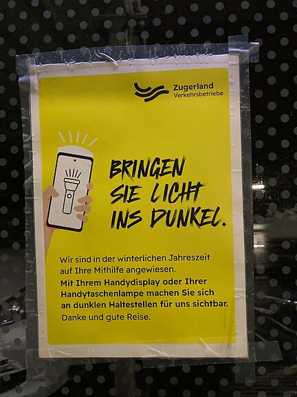Wenn die Tage kürzer und die Nächte dunkler werden, schlägt die Stunde der Buspassagiere. Die Zugerland Verkehrsbetriebe rufen mit Plakaten dazu auf, Licht ins Dunkel zu bringen – ganz buchstäblich. An unbeleuchteten Haltestellen sollen Fahrgäste mit Handy-Display oder Taschenlampe auf sich aufmerksam machen. Wir finden die Idee kreativ: Selbst im digitalen Zeitalter hat das gute alte «Leuchtzeichen» noch nicht ausgedient. (rem)