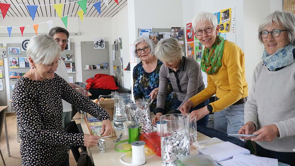Maria Frener, Margrit Freivogel, Lydia Gasser und ihre Kolleginnen füllen im Jugendbüro Sachseln am Bahnhof kleine Schöggeli in Cellophan-Säckli ab, verschliessen diese mit einem Schleifenband und bedienen sich bei den vorgedruckten Geburtstagskarten von Pro Senectute. Bald werden die süssen Grüsse in ihren Quartieren ihre Abnehmer finden. Die Frauen besuchen als Quartierpersonen im Namen von Pro Senectute Obwalden und Gleis 3 Seniorinnen und Senioren ab 80 zum Geburtstag.