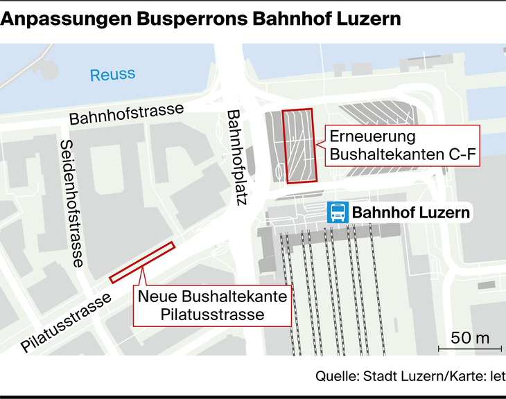 Seit Jahren streben Kanton, Stadt und Verkehrsverbund Luzern (VVL) den Bau neuer Bus-Durchmesserperrons beim Bahnhof an. Ein erstes Projekt wurde 2022 wegen hoher Kosten und den engen Verhältnissen auf dem Bahnhofplatz fallengelassen. Nun wird die damals angekündigte Alternative konkret, wie Kanton und Stadt mitteilen: Bis Ende 2026 soll in Fahrtrichtung Pilatusplatz an der Pilatusstrasse vor dem Globus eine neue Bushaltekante entstehen. Weiter geplant ist ein Umbau auf dem Bahnhofplatz.