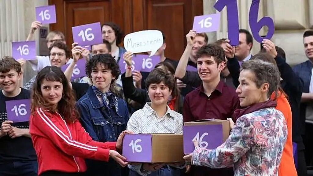 Die Initianten von der Allianz jung & engagiert 2023 bei der Einreichung der Intitiative für ein Stimmrechtsalter 16