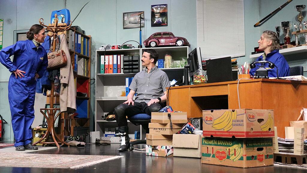 Fast liegt der Geruch von Öl und Benzin in der Luft. Auf die Bühne der Aula Cher ist eine Autogarage gezügelt. Eine Wand mit Werkzeugen, Autoreifen, ein Sofa für die Kunden, ein Schreibtisch mit Ordnern: Authentisch wirkt die Schrauber-Bude. Sie bildet den Rahmen für das aktuelle Stück des Gesellen-Theaters Sarnen. Diese führt eine Komödie von Oliver Grawehr auf.