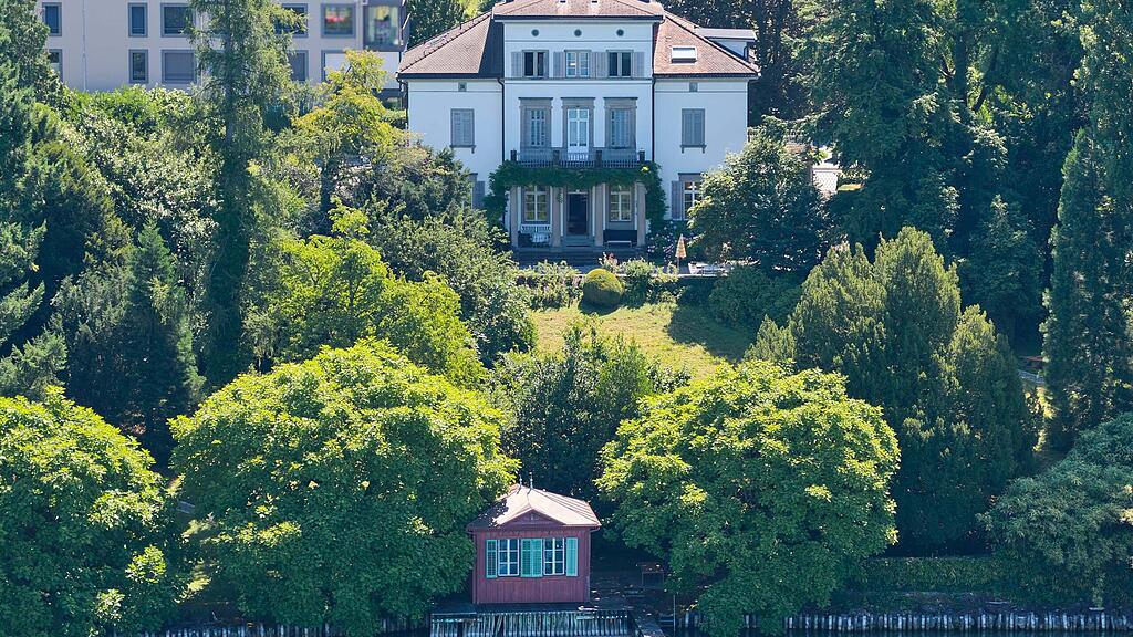 Man kann es sich lebhaft vorstellen, wie hier vor 150 Jahren eine Kutsche angehalten hat und gediegen gekleidete Gäste ausgestiegen sind, die vielleicht von einem Bediensteten empfangen wurden. Die Villa verfügt über ein grosses eisernes Vordach, sodass Bewohner und Besucherinnen des Hauses gleich vor den drei massiven Holztüren aussteigen konnten. Im Eingangsbereich dominieren dunkles Holz und ein gekachelter Boden, zwei Türen führen zum repräsentativen Salon des Herrschaftshauses, die Fenster geben einen spektakulären Blick auf den Zugersee frei. In einem Raum nebenan befindet sich eine Bibliothek mit juristischen Schriften aus den 1850er-Jahren, eine rot gemusterte Seidentapete und alte Gemälde zieren die Wände.