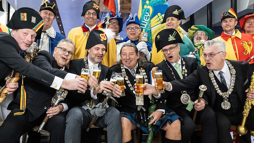 Wey-Zunftmeister Edgar Ming (Zweiter von recht, vordere Reihe) am Schalander-Empfang des Lozärner Fasnachtskomitees zusammen mit den anderen Fasnachtsgewaltigen.