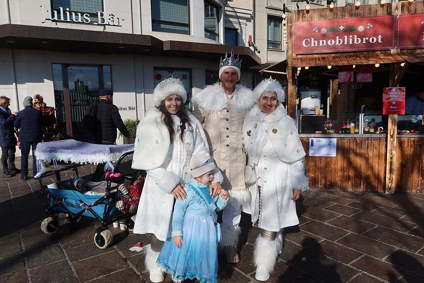 ... oder diese berühmten Heldinnen. Drei Generationen an der Fasnacht. Die Eltern und die Grossmutter als Schneeköniginnen beziehungsweise Schneekönig, die Kleine als Elsa. Die Kostüme haben sie mit viel Liebe selber gemacht, angefangen haben sie dafür schon im November.