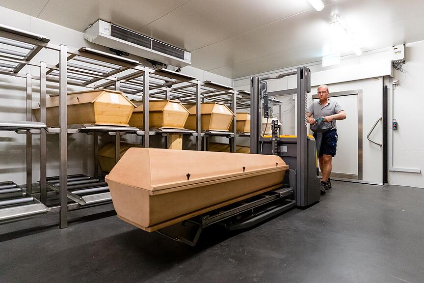 Wer nicht wissen sollte, wo er sich hier befindet, käme nicht auf die Idee, dass nur wenige Meter nebenan bereits Körper brennen. Der Empfangsbereich wirkt durch die roten Wände warm, Blumen zieren die Theke, dahinter warten zwei Kremationsmitarbeiter. Paul Gisler und Roland Zurkirch sind seit über zehn Jahren hier tätig. Es ist nicht das erste Mal, dass den beiden jemand bei der Arbeit über die Schulter blickt – zirka ein Mal monatlich möchte ein Angehöriger der Kremation eines Angehörigen beiwohnen. «Meist sind die Leute dann aber enttäuscht», sagt Paul Gisler. Denn: Viel zu sehen gibt es beim Kremieren nicht.